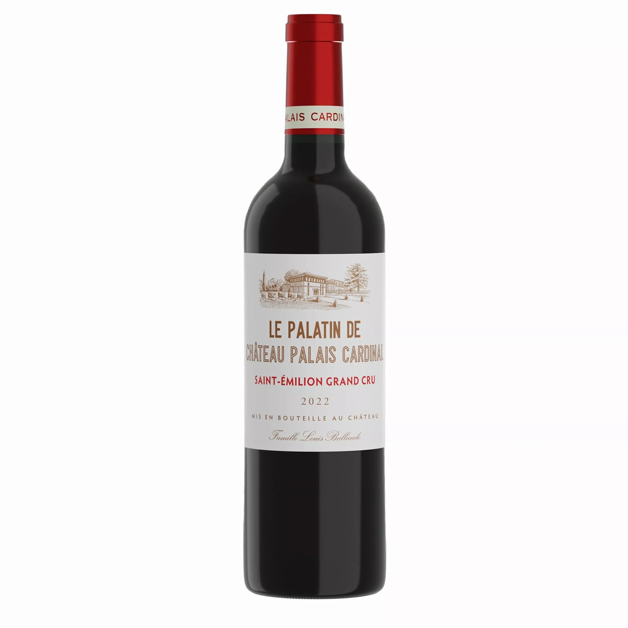 Le Palatin de Château Palais Cardinal is a red wine produced in the Saint-Émilion Grand Cru appellation of Bordeaux, France, and has been the estate's second wine since the 2016 vintage, replacing the previous label "Château Palais Cardinal - La Réserve". The wine is a Bordeaux-style red blend, primarily composed of Merlot (70%), with Cabernet Franc (20%) and a smaller proportion of Cabernet Sauvignon (10%) contributing to its structure and tannin profile. It is crafted from grapes sourced from young vines and is known for being generous, fruity, and fresh, with a balance of soft tannins and a nice structure. -